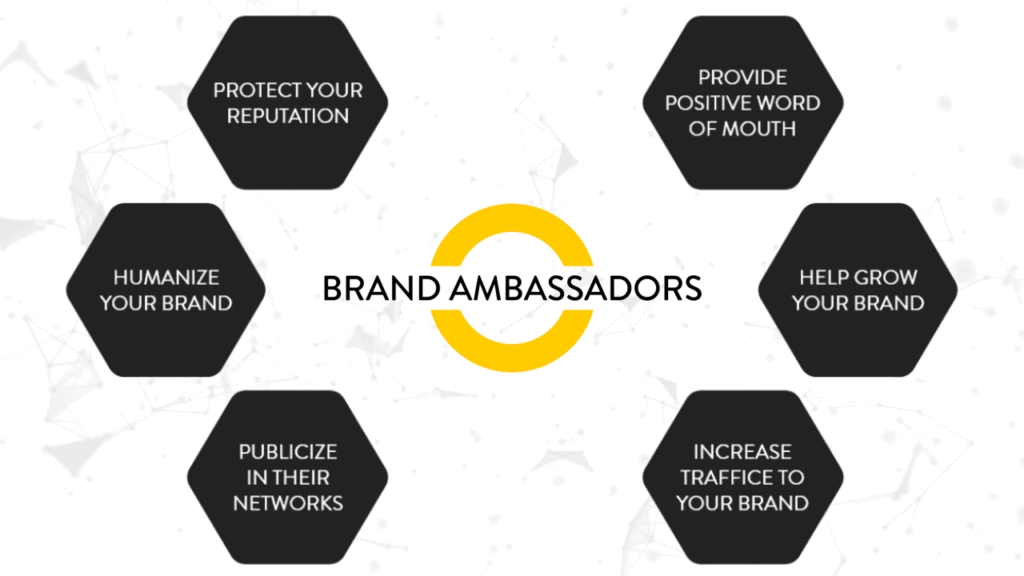 Ambassadors create content, write reviews, refer new customers, & do other tasks to help the brand reach new audiences.